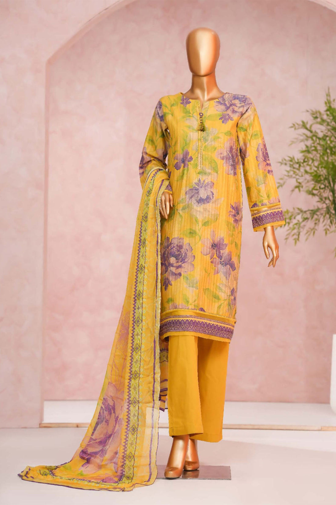 Hz Ready To Were Cotton Sunehri Paste Print With Embroidery Stitched Collection 2025. D-62 Mustard
