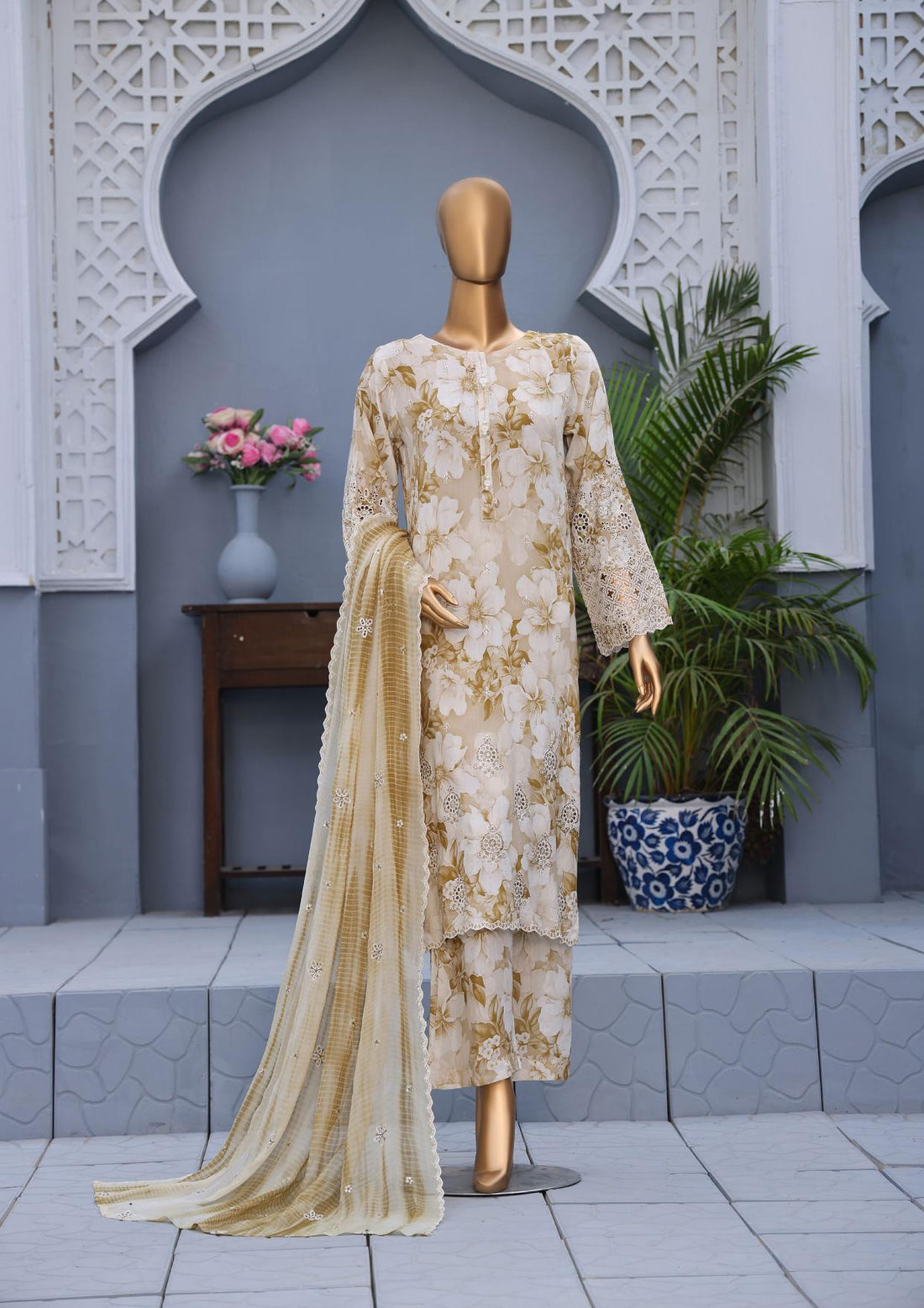 •Digital Printed Khaddar Chikankari Embroidered Shirt.•Digital Printed Khaddar Embroidered Dupatta.•Dyed Khaddar Trouser.