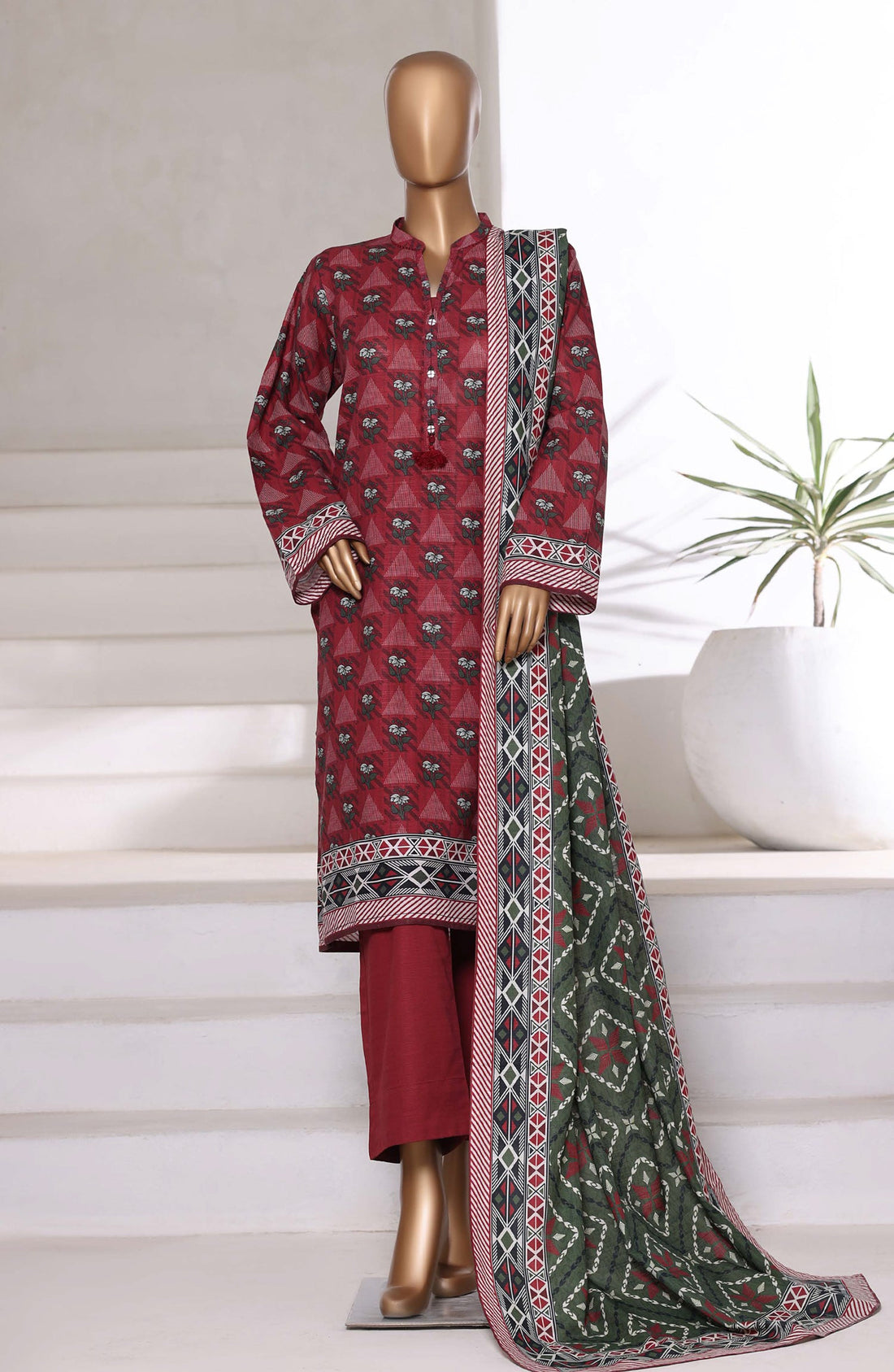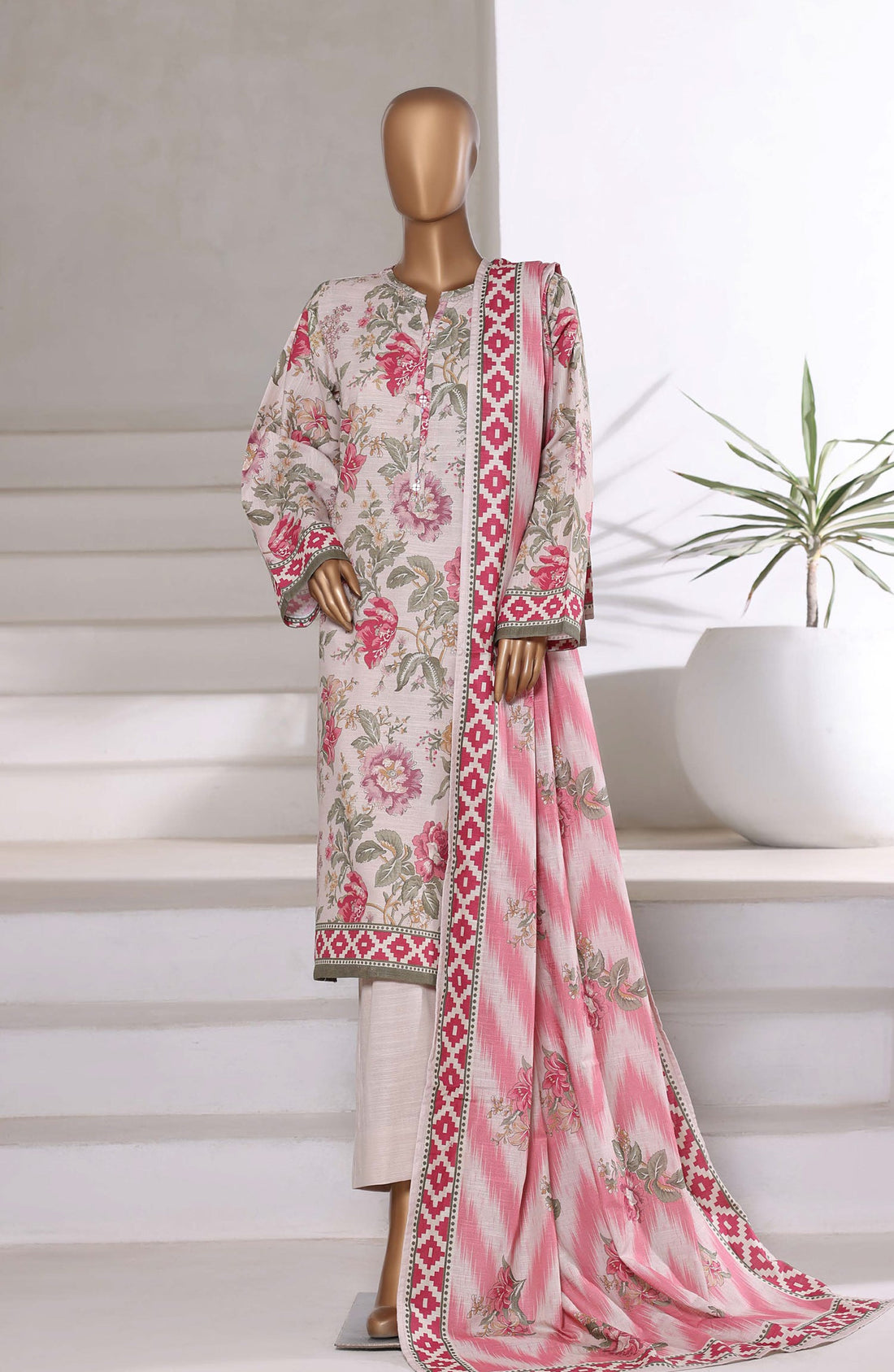 Digital print and embroidered stitch khaddar 3 piece suit